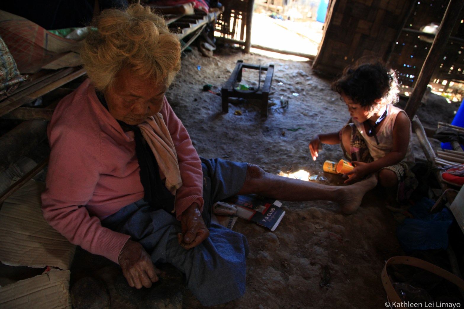 Nanay Merin prepares betel nut while her great granddaughter Rachelle tinkers with handmade soda tabs toy. The two had a brief conversation in Dumagat and then Rachelle ran off to play.