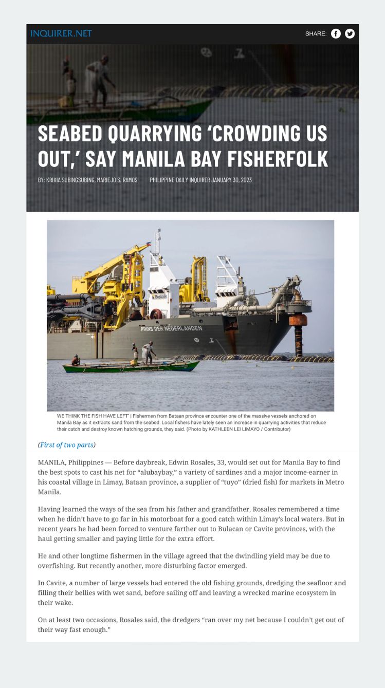 Seabed quarrying ‘crowding us out,’ say Manila Bay fisherfolk