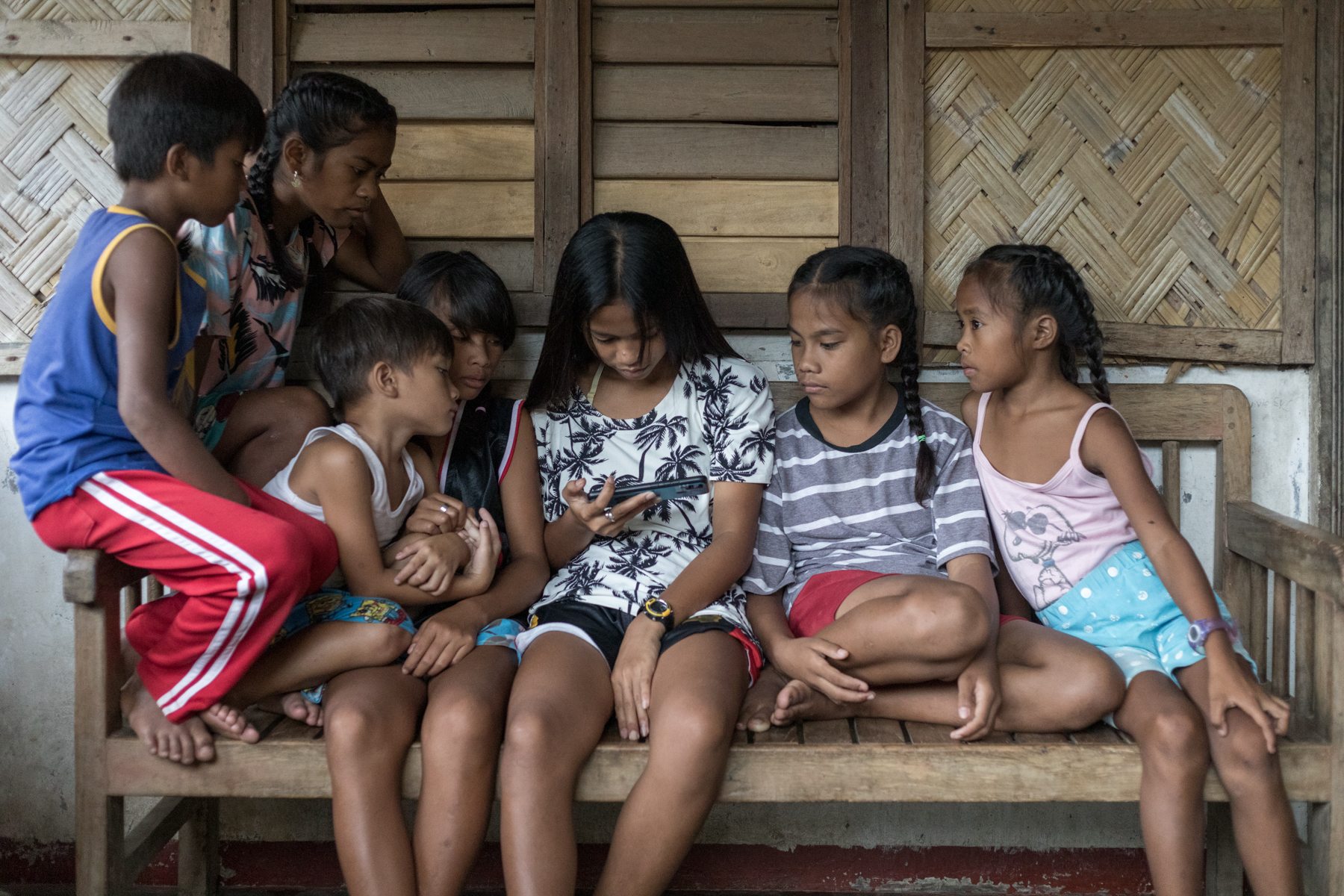 Kids gather to watch videos on a mobile phone that is powered by solar energy in Sitio Manggahan.